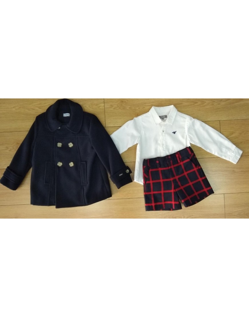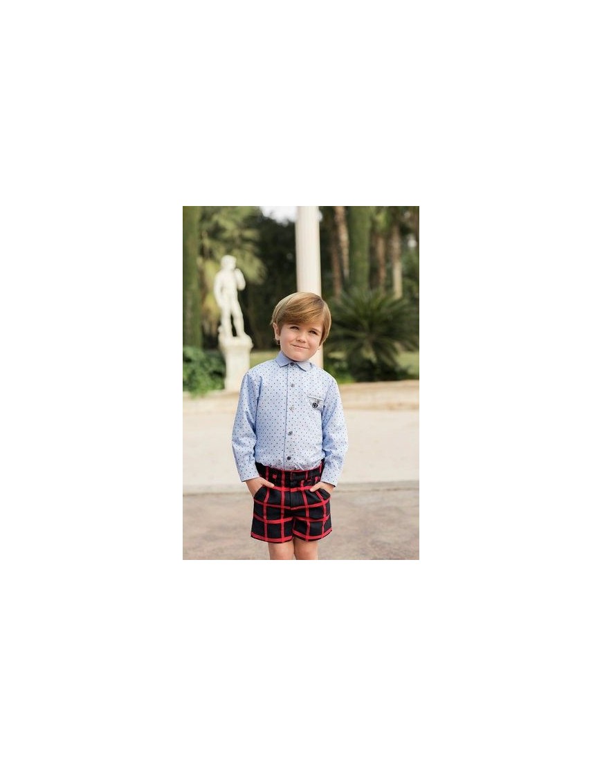 Pantalón azul marino con cuadros rojos.